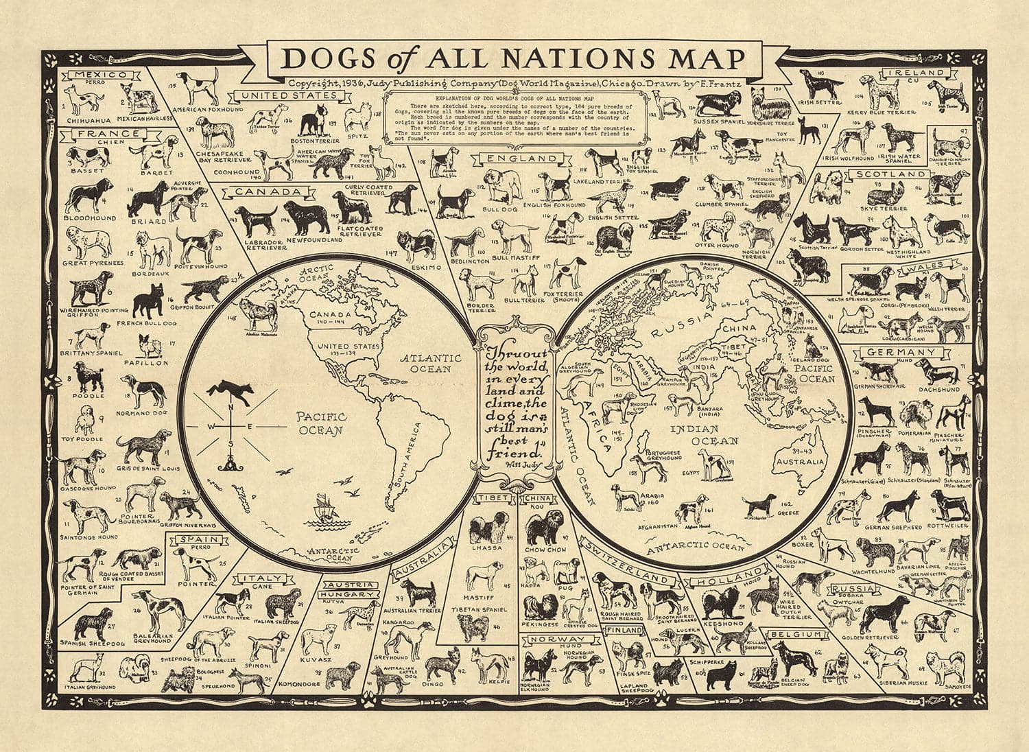 Old Dog Map, 1936: World Atlas Chart of Breeds