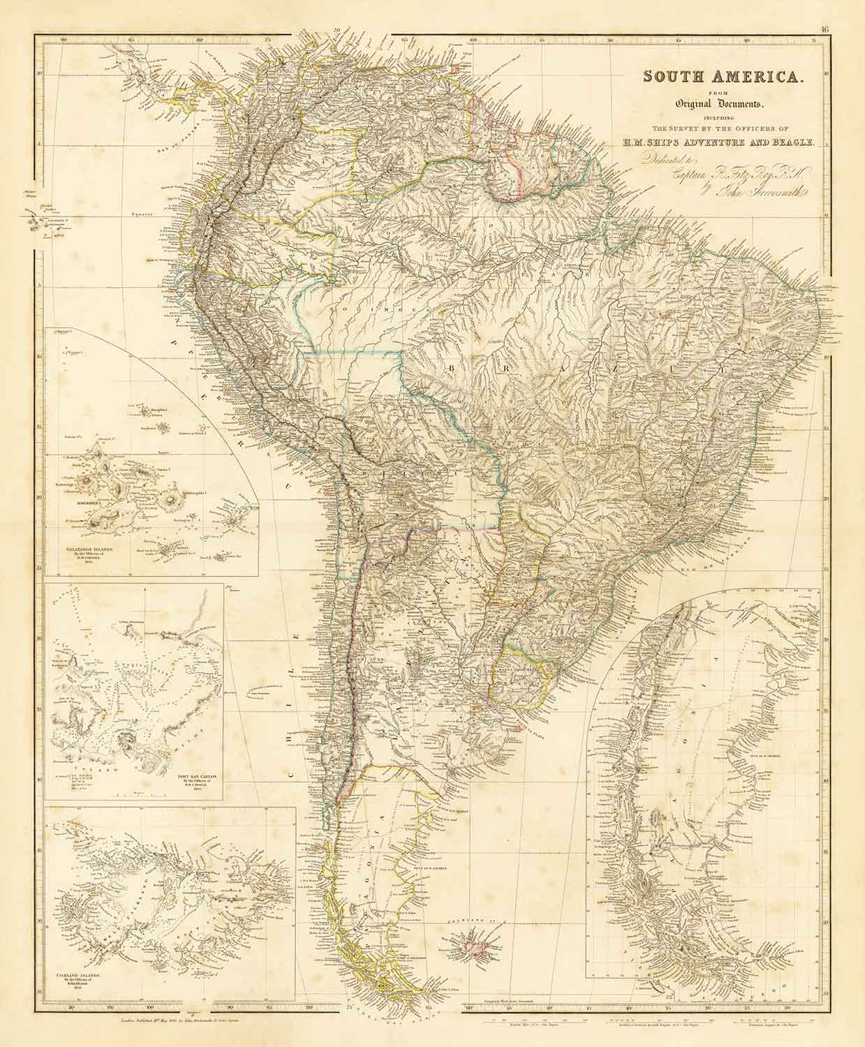 Old Map of South America, 1839 by Arrowsmith: Brazil, Galapagos, Islands, Colonial Guyana, Andes, Amazon, Ecuador