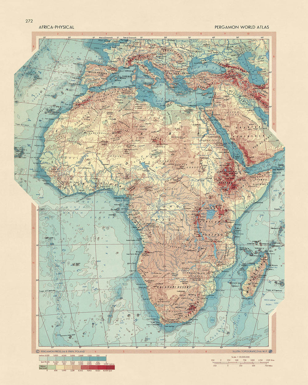 Behold the exquisite grandeur of the 'Africa - Physical' map, a breathtakingly detailed masterpiece originally published in 1967 by the esteemed Polish Army Topography Service. This map, while being a World Map, focuses its attention primarily on the captivating continent of Africa. The map's intricate detailing and meticulous attention to physical attributes provide an in-depth understanding of Africa's geographical layout. The physical characteristics are rendered with such precision that it transports the viewer to the heart of the continent, offering an immersive experience that transcends the constraints of time and space.