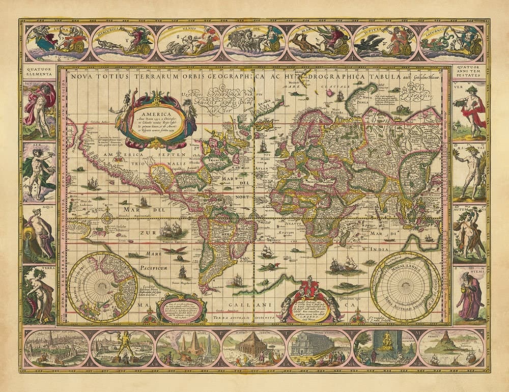This is widely considered to be the greatest world map ever created, originally published by Dutch cartographer Willem Blaeu in 1635 at the height of the Golden Age of Dutch Cartography.