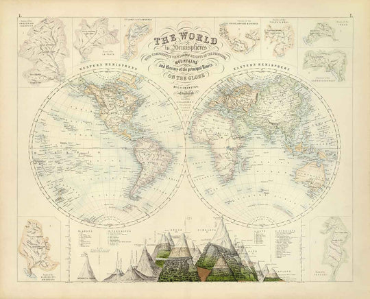 The world map is surrounded by gorgeous details, such as illustrations of the world's major river systems (Amazon, Volga, Danube, Mississippi Missouri, etc) and also a side-on view of the world's largest mountain ranges (Himalayas, Andes, Alps, and a few others). Curiously, Everest (then known as peak XV) is not shown. Instead, Kangchenjunga is shown as the world's highest mountain - but later it would be revised down to 3rd place and Everest would be crowned the tallest.