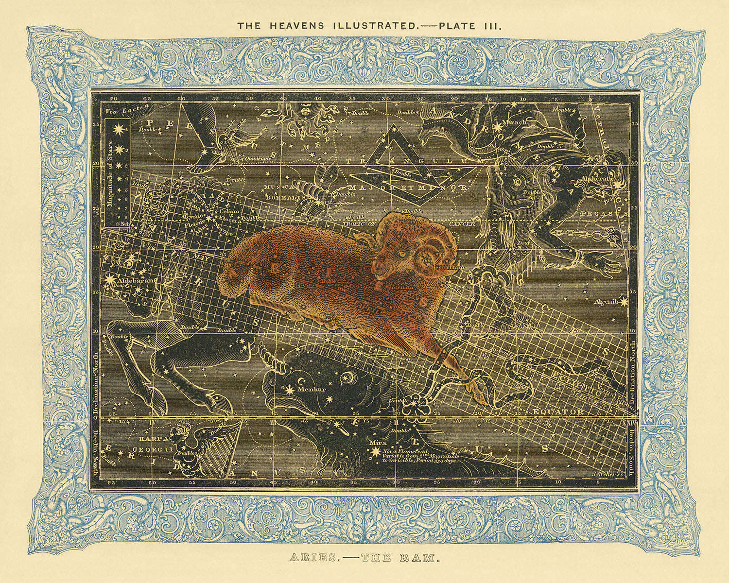 Die Verwendung von Handkolorierung in dieser Sternenkarte verleiht der Darstellung des Widders eine reiche, taktile Qualität. Die sorgfältige Farbgebung und detaillierte Illustration des Sternbildes zeigen die Kunstfertigkeit und Präzision der damaligen Zeit. Den Druck dieses Werkes zu besitzen, bringt ein Stück historischer und wissenschaftlicher Kunst in Ihr Zuhause, sodass Sie sowohl die ästhetischen Merkmale als auch die Bedeutung in der Geschichte der Astronomie schätzen können.