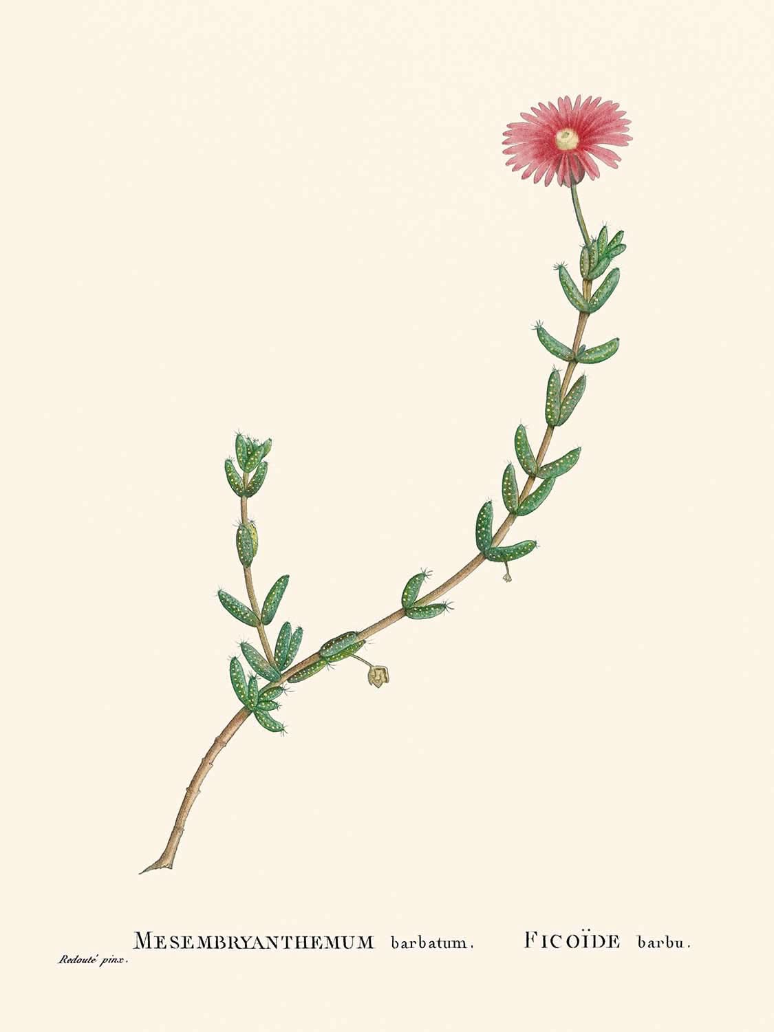 Die Arbeiten von Pierre-Joseph Redouté werden für ihre exquisiten Details und den feinfühligen Einsatz von Farben gefeiert. Diese Illustration von „Mesembryanthemum Barbatum“ fängt die einzigartige Schönheit der bärtigen Ringelblume ein, die botanisch auch als Mesembryanthemum Barbatum bekannt ist. Die sanften Farbtöne und das komplizierte Design vermitteln ein Gefühl natürlicher Anmut und machen es nicht nur zu einem bezaubernden Kunstwerk, sondern auch zu einem lehrreichen Einblick in die botanischen Wunder der Vergangenheit. Die Einzigartigkeit dieses Werks liegt in seinem historischen Kontext und Redoutés Fähigkeit, wissenschaftliche Präzision mit künstlerischem Flair zu verbinden, wodurch sein Vermächtnis als Meister der Blumenillustration gesichert ist.