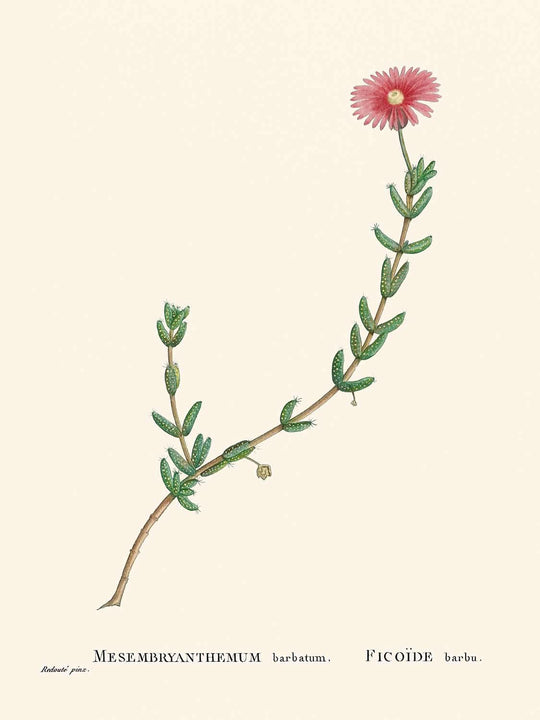 Ein Druck mit dem Titel „Bearded Fig-Marigold“ in Ihrer Sammlung ist mehr als nur ein Kunstwerk; es ist ein Stück Geschichte, in dem sich Kunst und Natur auf wunderbare Weise kreuzen. Dieser Druck ist perfekt für Botanik-Enthusiasten, Kunstsammler oder jeden, der sich für die historischen Werke außergewöhnlicher Künstler interessiert. Er ist ein Zeugnis von Redoutés reichem Beitrag zur botanischen Kunst und bringt die Eleganz der Gärten des Château de Malmaison in Ihr eigenes Zuhause.