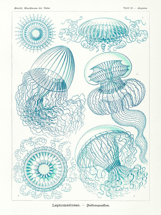 Leptomedusae Faltenquallen, erstmals veröffentlicht im Jahr 1904, ist eine atemberaubende Medusenillustration des angesehenen deutschen Biologen und Künstlers Ernst Haeckel. Dieses Werk, ein exquisit Beispiel aus seinem bedeutenden Werk "Kunstformen der Natur", fängt die komplizierte Schönheit und die zarte Struktur des marinen Lebens ein.