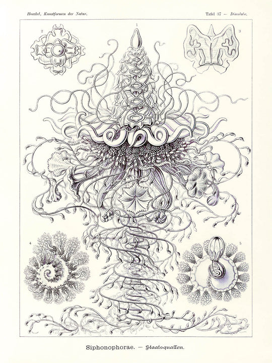 "Siphonophorae Staatsquallen (Tafel 37)" von Ernst Haeckel, erstmals veröffentlicht im Jahr 1904, ist eine atemberaubende Illustration von Quallen aus dem renommierten Werk "Kunstformen der Natur." Dieses Kunstwerk zeigt lebhaft mehrere elegante Quallenarten, die jede sorgfältig detailliert sind, um ihre einzigartigen Merkmale und ätherische Schönheit hervorzuheben.