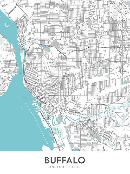 Diese Karte von Buffalo, New York, ist eine moderne, detaillierte Straßenkarte ohne Beschriftung. Der Schwerpunkt liegt auf der Stadt Buffalo und ihren umliegenden Gebieten und bietet eine genaue und optisch ansprechende Darstellung des Stadtgrundrisses. Die Karte deckt eine Vielzahl von Stadtteilen ab, darunter Allentown, Black Rock, Elmwood Village und North Buffalo, von denen jedes seinen eigenen Charakter und Charme hat.