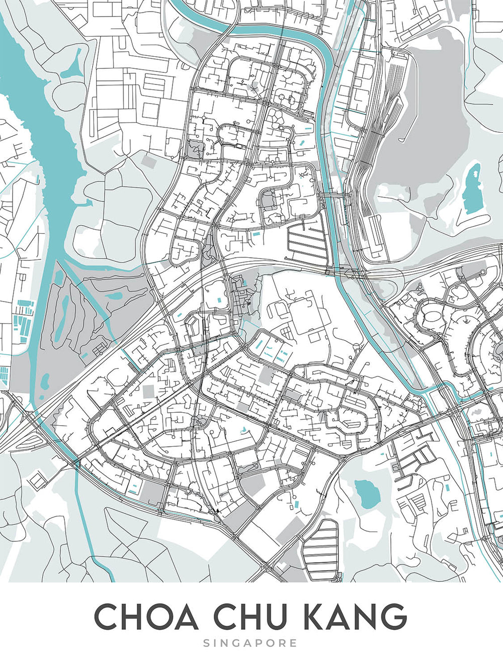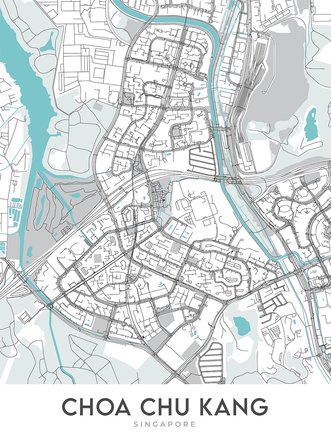 Als dekoratives Stück dient diese Karte als atemberaubender visueller Anker in jedem Raum und lädt den Betrachter ein, in die Feinheiten des Grundrisses von Choa Chu Kang einzutauchen. Das Fehlen von Beschriftungen steigert ihren ästhetischen Wert und ermöglicht einen ungehinderten Blick auf die Struktur des Viertels, was sie zu einer perfekten Kulisse für ein minimalistisches oder zeitgenössisches Interieur macht. Diese Karte feiert nicht nur die Schönheit kartografischer Kunst, sondern verwandelt auch eine gewöhnliche Wand in einen Mittelpunkt kulturellen und künstlerischen Interesses.