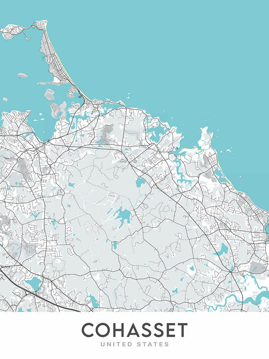 Cohasset ist eine charmante Küstenstadt an der Südküste von Massachusetts, etwa 20 Meilen südöstlich von Boston. Die Stadt ist für ihre wunderschönen Strände, historischen Stätten und atemberaubenden Naturlandschaften bekannt. Diese Karte bietet einen intimen Einblick in die Stadt und ihre Umgebung und ermöglicht es dem Betrachter, die komplizierten Details und einzigartigen Eigenschaften dieses besonderen Ortes zu schätzen.