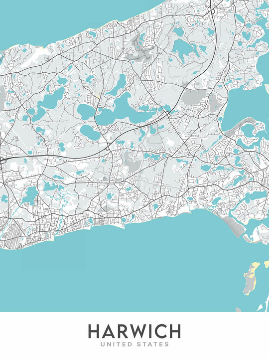 Diese Karte von Harwich, Massachusetts, ist eine moderne, detaillierte Straßenkarte ohne Beschriftung. Die Karte deckt ein Gebiet von etwa 9 Meilen von Ost nach West und 11 Meilen von Nord nach Süd ab, wobei das Stadtzentrum ungefähr in der Mitte liegt. Das bedeutet, dass sich die Karte etwa 4,5 Meilen westlich des Mittelpunkts und 4,5 Meilen östlich des Mittelpunkts erstreckt. Die Karte erstreckt sich etwa 5,5 Meilen nördlich des Mittelpunkts und 5,5 Meilen südlich des Mittelpunkts.