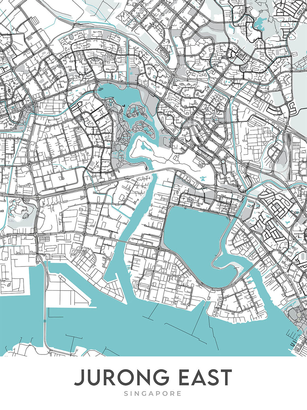 Die lebendige Essenz von Jurong East einzufangen, lädt diese zeitgenössische Karte die Betrachter ein, eine der dynamischsten Regionen Singapurs aus einer einzigartigen Perspektive zu erkunden. Jurong East, ein blühendes Wohn- und Gewerbezentrum, wird in atemberaubenden Details dargestellt, wobei sein Netzwerk von Straßen, Wahrzeichen und Grünflächen ohne die Unordnung von Beschriftungen präsentiert wird. Diese künstlerische Wahl hebt die Karte von einem einfachen Navigationswerkzeug zu einem modernen Kunstwerk hervor und betont das geordnete Straßennetz der Nachbarschaft sowie die bemerkenswerten Sehenswürdigkeiten, die es prägen. Der Fokus der Karte auf Jurong East spiegelt nicht nur seine aktuelle Bedeutung als wichtiger Stadtteil in Singapur wider, sondern auch seine kontinuierliche Transformation und Wachstum, was es zu einem faszinierenden Thema für sowohl Anwohner als auch Bewunderer des urbanen Designs macht.
