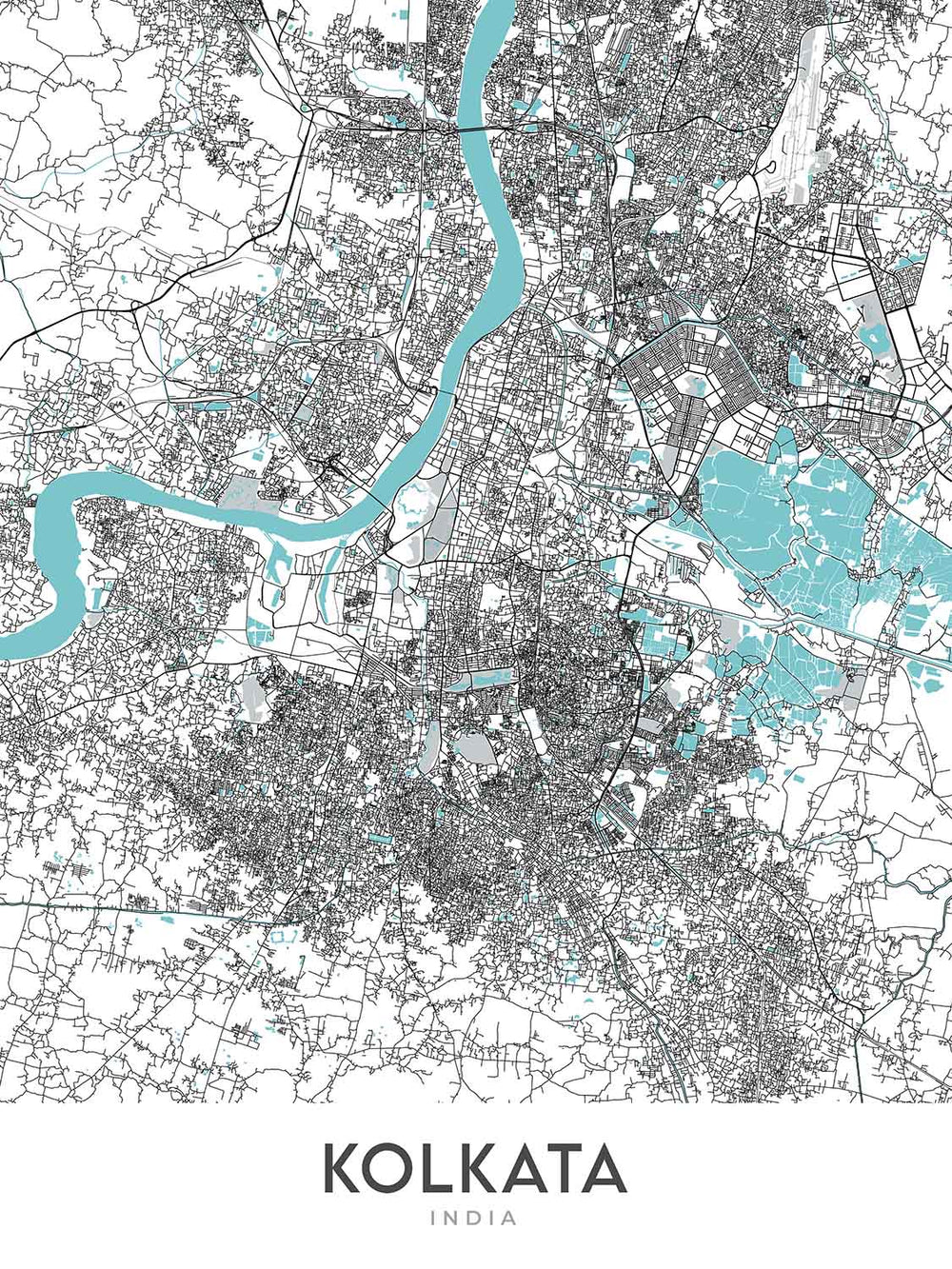 Zusätzlich zu ihrer visuellen Anziehungskraft bietet die Karte einen Einblick in das dynamische Leben von Kolkata. Wahrzeichen wie das Victoria Memorial, der Kalighat-Tempel und der Rabindra Sarobar sind subtil innerhalb des Straßennetzes hervorgehoben und laden die Betrachter ein, die kulturelle und geografische Vielfalt der Stadt zu erkunden. Die Einbeziehung solcher ikonischen Stätten verleiht der Karte Tiefe und macht sie nicht nur zu einem dekorativen Stück, sondern auch zu einer Feier des Erbes und der zeitgenössischen Lebendigkeit von Kolkata.