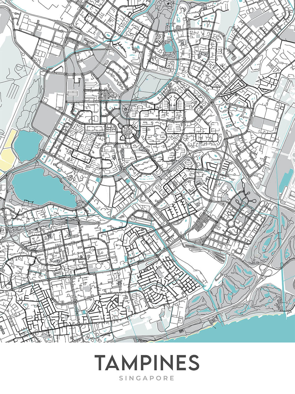 Und schließlich bedeutet der Besitz dieser Karte, dass Sie ein Stück Tampines in Ihre Wohnung bringen und eine persönliche Verbindung mit der Nachbarschaft herstellen, egal ob Sie dort wohnen, ein ehemaliger Besucher sind oder jemand, der die Schönheit gut gemachter Kartografie zu schätzen weiß. Sie dient nicht nur als dekoratives Element, sondern ist auch eine Hommage an die urbane Vielfalt Singapurs und ist damit ein geschätzter Gegenstand für jeden, der sich für modernes Design, Geografie und die Kunst der Kartografie interessiert. Diese Karte ist eine Hommage an die Harmonie zwischen Stadtplanung und natürlicher Schönheit, eingefangen durch die Linse hochwertigen kartografischen Designs.