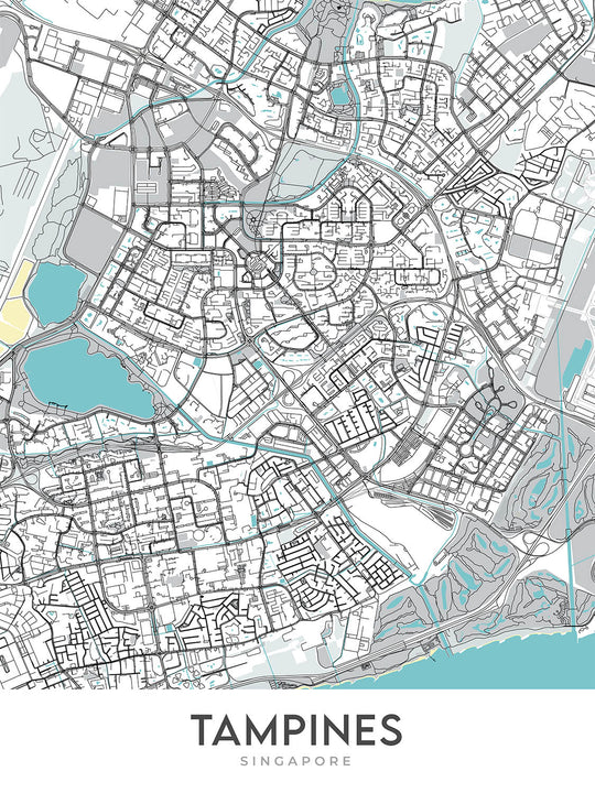 Tauchen Sie mit dieser exquisit gestalteten Karte in die komplizierten Details von Tampines ein, einem lebendigen Viertel im geschäftigen Stadtstaat Singapur. Diese moderne Nachbarschaftskarte mit dem Titel „Tampines“ fängt die Essenz des städtischen Lebens in Kombination mit Grünflächen ein und spiegelt die dynamische Mischung aus Natur und Urbanität wider, die das Gebiet charakterisiert. Diese Karte konzentriert sich auf einen detaillierten Straßenplan und bietet einen Einblick in den Grundriss des Gebiets ohne das Durcheinander von Straßennamen, sodass der Betrachter die klaren Linien und die moderne Designästhetik schätzen kann. Das Viertel Tampines ist bekannt für sein zusammenhängendes Gemeinschaftsgefühl, seine geschäftigen Einkaufszentren und ausgedehnten Parkanlagen, was diese Karte nicht nur zu einem visuellen Genuss macht, sondern auch zu einer Darstellung eines ausgewogenen städtischen Lebensstils.