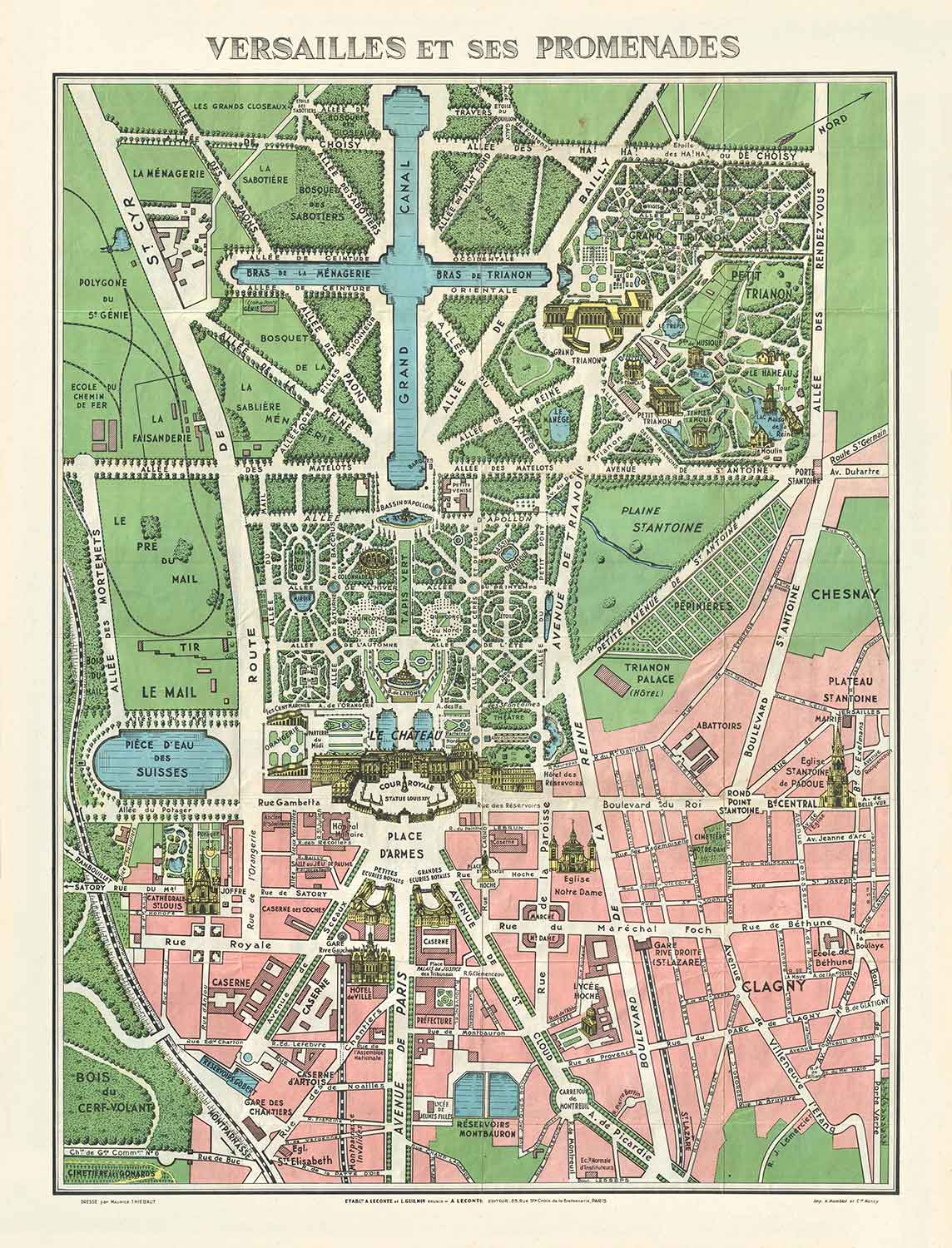 Eine sehr farbenfrohe Karte, die die massive Größe und Pracht von Versailles demonstriert. Als ehemalige königliche Residenz, die zwischen 1631 und 1634 von König Ludwig XIV. erbaut wurde, ist sie heute bekannt für ihren Garten, ihre Architektur und ihre Wasseranlagen (einschließlich musikalischer Gartenshows). Sie ist eines der meistbesuchten Sehenswürdigkeiten in Frankreich.