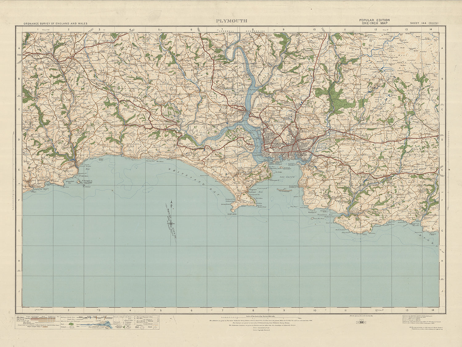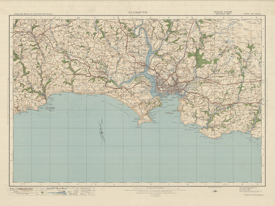 Tauchen Sie ein in die historische Pracht Englands mit dieser antiken Ordnance Survey Karte mit dem Titel "Sheet 144 - Plymouth" aus der One-inch "Popular" Ausgabe, die zwischen 1919 und 1926 produziert wurde. Diese Karte ist ein bezauberndes Fenster zu einer bedeutenden Epoche der britischen Geschichte und deckt eine rechteckige Landmasse ab, die sich von Norden nach Süden über 18 Meilen und von Westen nach Osten über 27 Meilen erstreckt, diagonal erstreckt sie sich über beeindruckende 32 Meilen. Im Zentrum steht das Dorf Millbrook in Devon. Die Karte zeigt Teile der Grafschaften Devon und Cornwall, die beide für ihre zerklüfteten Küsten und malerischen Städte bekannt sind.