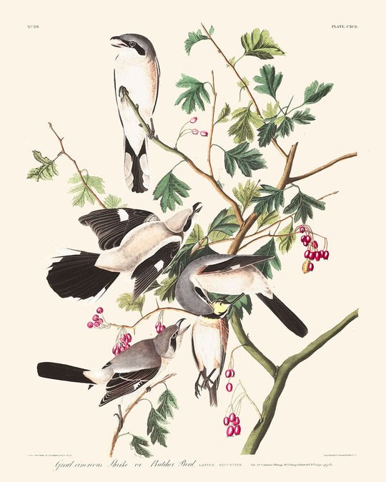 Die künstlerische Darstellung dieser Art besticht durch ihre klar definierten Farbtöne und aufwendige Komposition. Interessanterweise scheint der Würger die Notrufe anderer Vögel nachzuahmen, um Beute anzulocken, ein Verhalten, das Audubon anschaulich beschreibt. Der Besitz eines Kunstdrucks dieser Illustration feiert nicht nur diesen neugierigen Vogel, sondern würdigt auch Audubons Vermächtnis als Künstler.