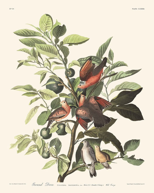 Die Erdtaube, wissenschaftlich bekannt als Columba passerina, ist hier mit lebendiger Genauigkeit dargestellt. Audubons geschickter Umgang mit Farben – er kombiniert sanfte Purpurrot-, Hellblau- und Weinrottöne mit der subtilen Eleganz des Verhaltens der Taube – macht diesen Druck nicht nur wissenschaftlich bedeutsam, sondern auch visuell atemberaubend. Er spiegelt die natürlichen Lebensräume des Vogels wider, von den grünen Meeresinseln Georgias bis zu den üppigen Landschaften Ostfloridas, und fängt seine innere Schönheit und sanfte Natur ein.