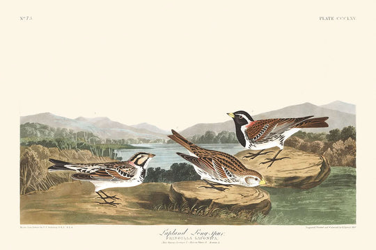 Der Lappland-Sporenvogel, erstmals 1827 veröffentlicht, ist eine fesselnde Illustration aus John James Audubons berühmtem Werk The Birds of America. Diese exquisite Darstellung hebt die natürliche Anmut und die komplexe Schönheit des Lappland-Sporenvogels hervor, einer Art, die wissenschaftlich als Calcarius lapponicus bekannt ist. Audubons Fähigkeit, das Wesen der amerikanischen Vogelwelt einzufangen, wird in dieser eleganten Illustration voll zur Schau gestellt.