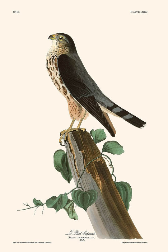 Le Petit Caporal, heute bekannt durch Merlin, geschaffen von dem legendären John James Audubon, ist eine herausragende Vogelillustration, die erstmals 1827 als Teil seines monumentalen Werks "Vögel von Amerika" veröffentlicht wurde. Dieses exquisite Stück verkörpert Audubons Hingabe an detaillierte und lebensechte Darstellungen von Vogelarten und bietet einen faszinierenden Einblick in die ornithologischen Wunder Nordamerikas im frühen 19. Jahrhundert.