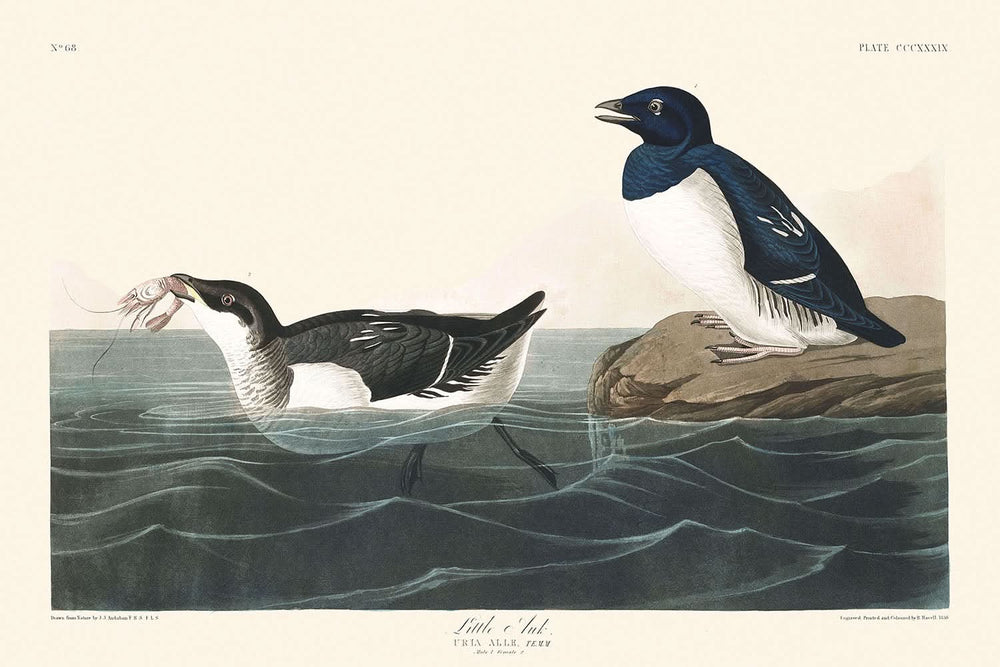 Audubon, ein berühmter Ornithologe und Maler, begann mit der Erstellung von The Birds of America, um die vielfältigen Vogelarten des Kontinents zu dokumentieren. Seine Illustrationen zeichnen sich durch ihre Präzision und Kunstfertigkeit aus und stellen jeden Vogel in Lebensgröße inmitten sorgfältig wiedergegebener natürlicher Umgebungen dar. Die Illustration des Krabbentauchers ist nicht nur wegen seines künstlerischen Werts von Bedeutung, sondern auch, weil sie eine Art einfängt, die selbst zu Audubons Zeiten äußerst selten war.