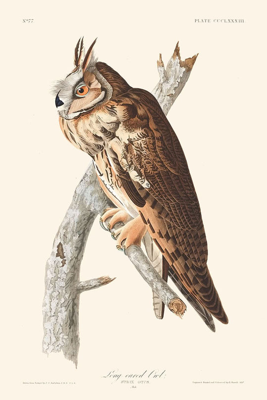 In dieser Illustration verschmilzt die Farbpracht – ein Gemisch aus Gelbbraun, gesprenkelt mit Braun- und Grauweißtönen – nahtlos mit der natürlichen Umgebung der Eule. Die komplizierten Muster auf ihren Federn und die ausgeprägte Struktur ihrer länglichen Büschel verkörpern Audubons Meisterschaft darin, die Lebendigkeit der Natur auf Papier zu übertragen. Dieser Druck spricht nicht nur Kunstkenner an, sondern ist auch eine schöne Ergänzung für die Sammlung eines jeden Ornithologen.