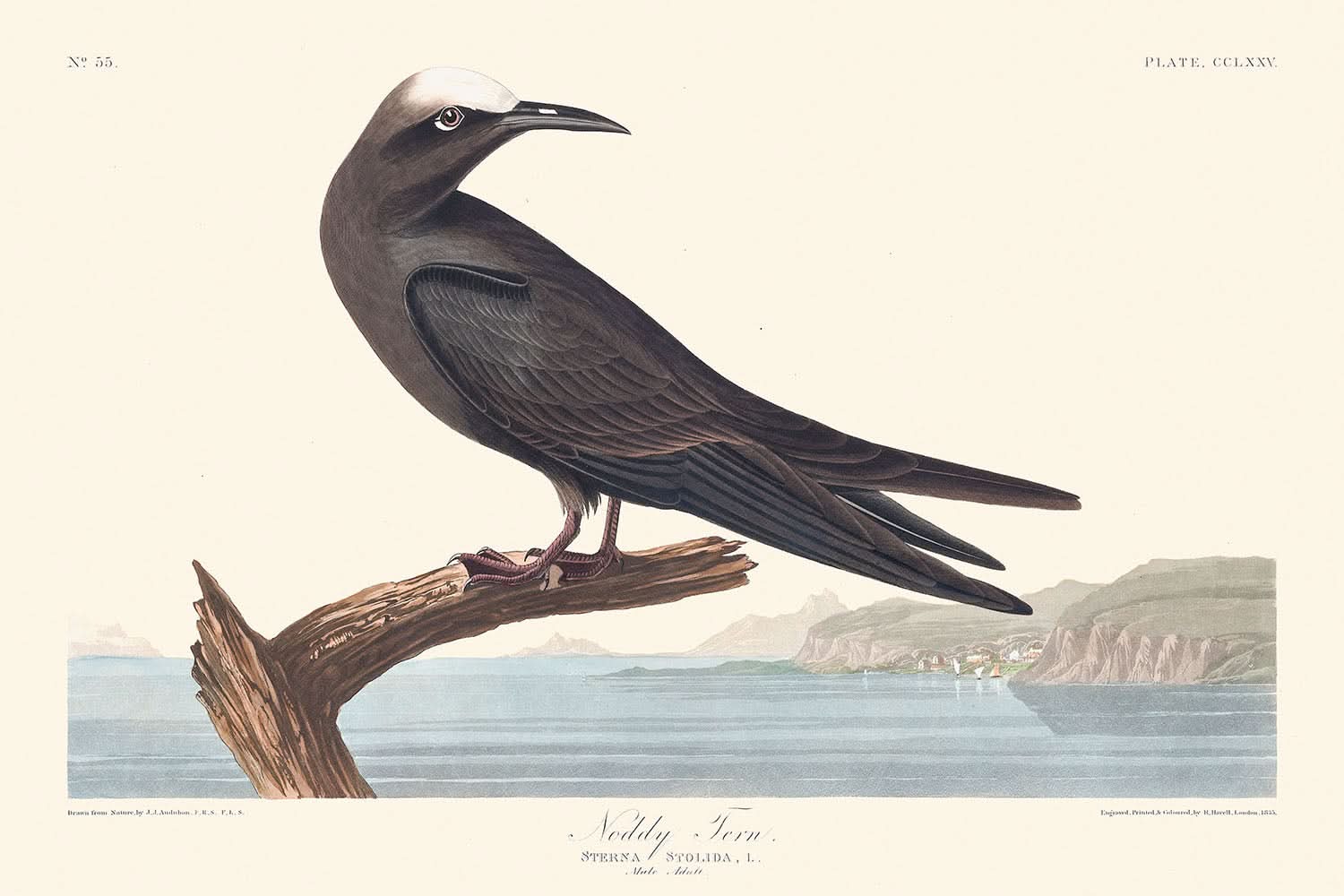 Noddy Tern (Tafel 275), geschaffen vom berühmten John James Audubon und erstmals 1827 veröffentlicht, ist eine großartige Illustration aus seinem ikonischen Werk „Birds of America“. Dieses besondere Stück zeigt die faszinierende Noddy Tern, einen Vogel, der im Golf von Mexiko häufig vorkommt und für seine einzigartigen Nist- und Fressgewohnheiten bekannt ist, wie Audubon selbst beobachtet hat.