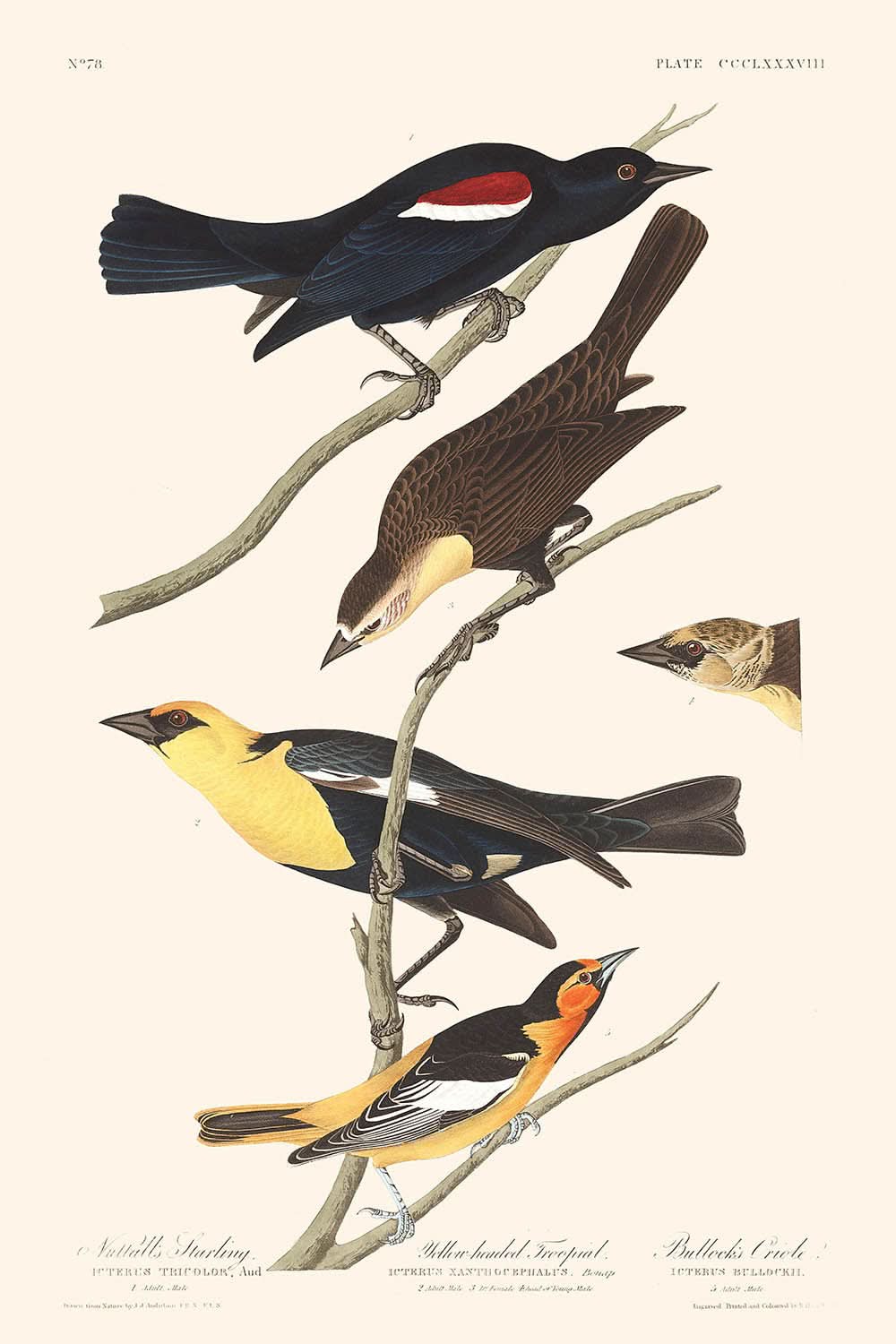 Das Kunstwerk selbst zeigt drei Arten: Nuttallstar, Gelbkopf-Troopial und Bullockpirol. Audubons farbenfrohe und detailreiche Darstellung dieser Vögel bietet einen außergewöhnlichen Einblick in ihr natürliches Verhalten und ihren Lebensraum. Besonders bemerkenswert ist der Gelbkopf-Troopial (Icterus xanthocephalus), dessen auffälliger orange-gelber Kopf sich vom glänzend schwarzen Körper abhebt und sowohl Eleganz als auch Besonderheit in seinem Design vermittelt.