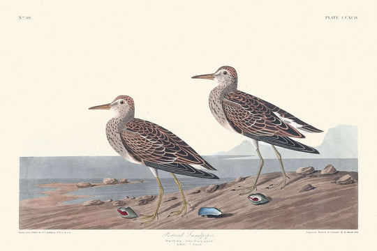 Wir präsentieren den bezaubernden „Pectoral Sandpiper“, eine exquisite Illustration aus der berühmten „Birds of America“-Reihe von John James Audubon, die erstmals 1827 veröffentlicht wurde. Diese sorgfältige Darstellung fängt die Eleganz und natürliche Anmut des Pectoral Sandpiper ein, eines Vogels, der für seine Präsenz an den Ostküsten der Vereinigten Staaten und sogar bis nach England bekannt ist.