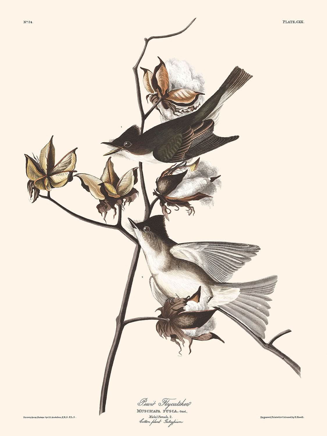 Der Pewit-Fliegenschnäpper ist nicht nur wegen seines wissenschaftlichen Interesses bemerkenswert, sondern auch wegen der Kunstfertigkeit von Audubons Darstellung. Audubon hat kleinste Details der einzigartigen Gewohnheiten und Morphologie des Vogels festgehalten, wie etwa den ungewöhnlichen Bau seiner Nester und seine eigentümlichen Wandermuster. Die Farben in diesem Stück, mit dunklen Olivbrauntönen, die durch hellere Töne kontrastiert werden, erzeugen ein reichhaltiges und strukturiertes Bild, das sowohl für Kunstliebhaber als auch für Naturforscher gleichermaßen ansprechend und lehrreich ist.