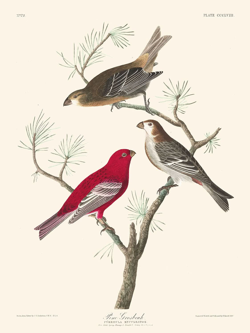 Der Fichtenkreuzschnabel, oder Pyrrhula Enucleator, der hier dargestellt ist, wird nicht nur für seine fesselnde ästhetische Anziehung gefeiert, sondern auch für seine robuste Natur und sein charmantes Lied. Ein Bewohner Nordamerikas, die auffälligen karminfarbenen Töne und das sanfte Wesen dieses Vogels unter Audubons geschickter Hand machen diesen Druck zu einem sowohl künstlerischen als auch lehrreichen Asset für jede Sammlung.