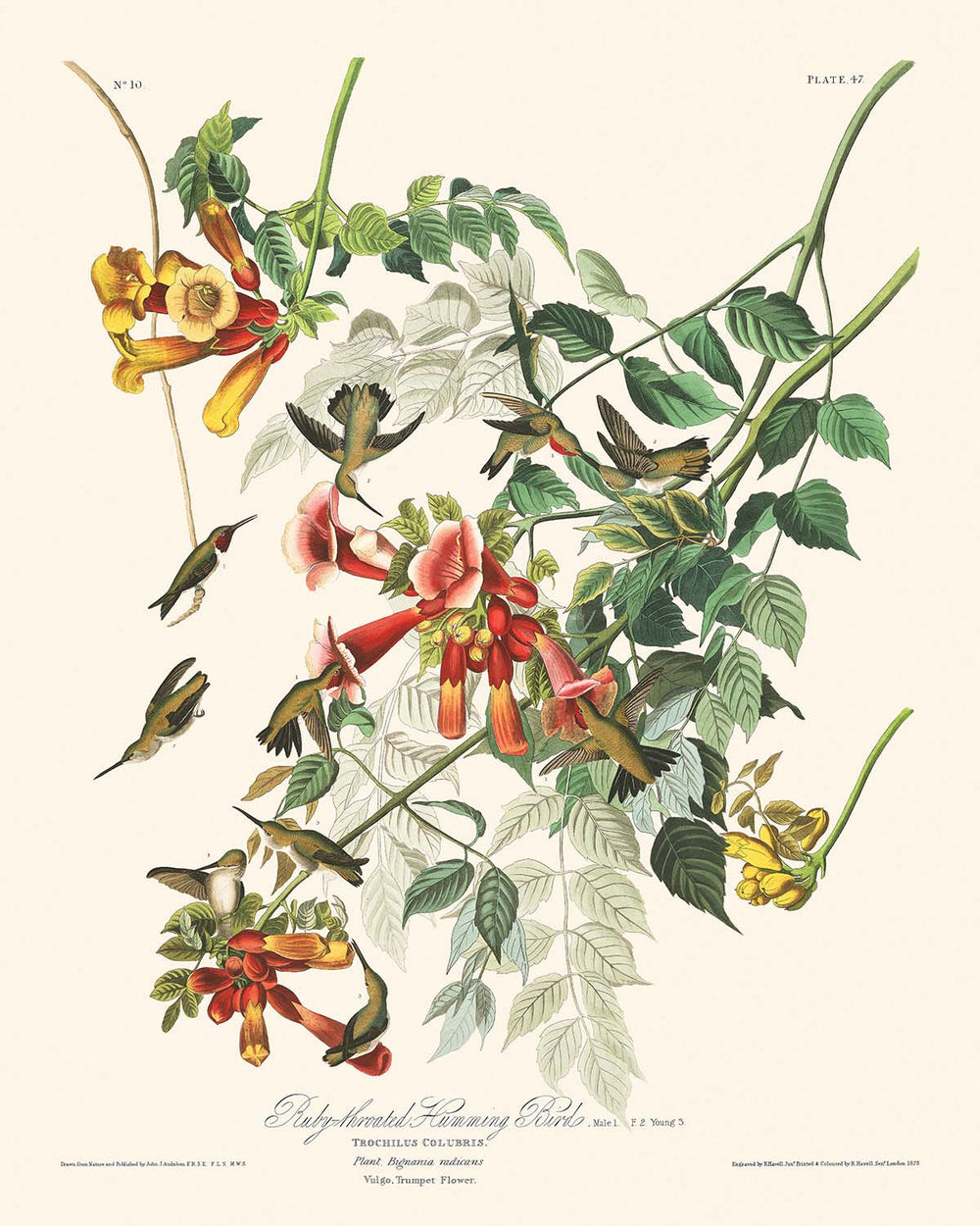 Der illustrierte rubinrote Kolibri, wissenschaftlich als Trochilus colubris bezeichnet, wird mit akribischer Detailgenauigkeit und atemberaubender Farbgebung dargestellt. Das Kunstwerk verwendet ausdrucksstarke Farbtöne und zeigt den schillernden smaragdgrünen Kopf und Rücken des Vogels sowie die feurige rote Kehle, die der Art ihren Namen verleiht. Das komplexe Design spiegelt Audubons Talent wider, das dynamische Wesen und den lebhaften Geist dieses winzigen gefiederten Wunders einzufangen.