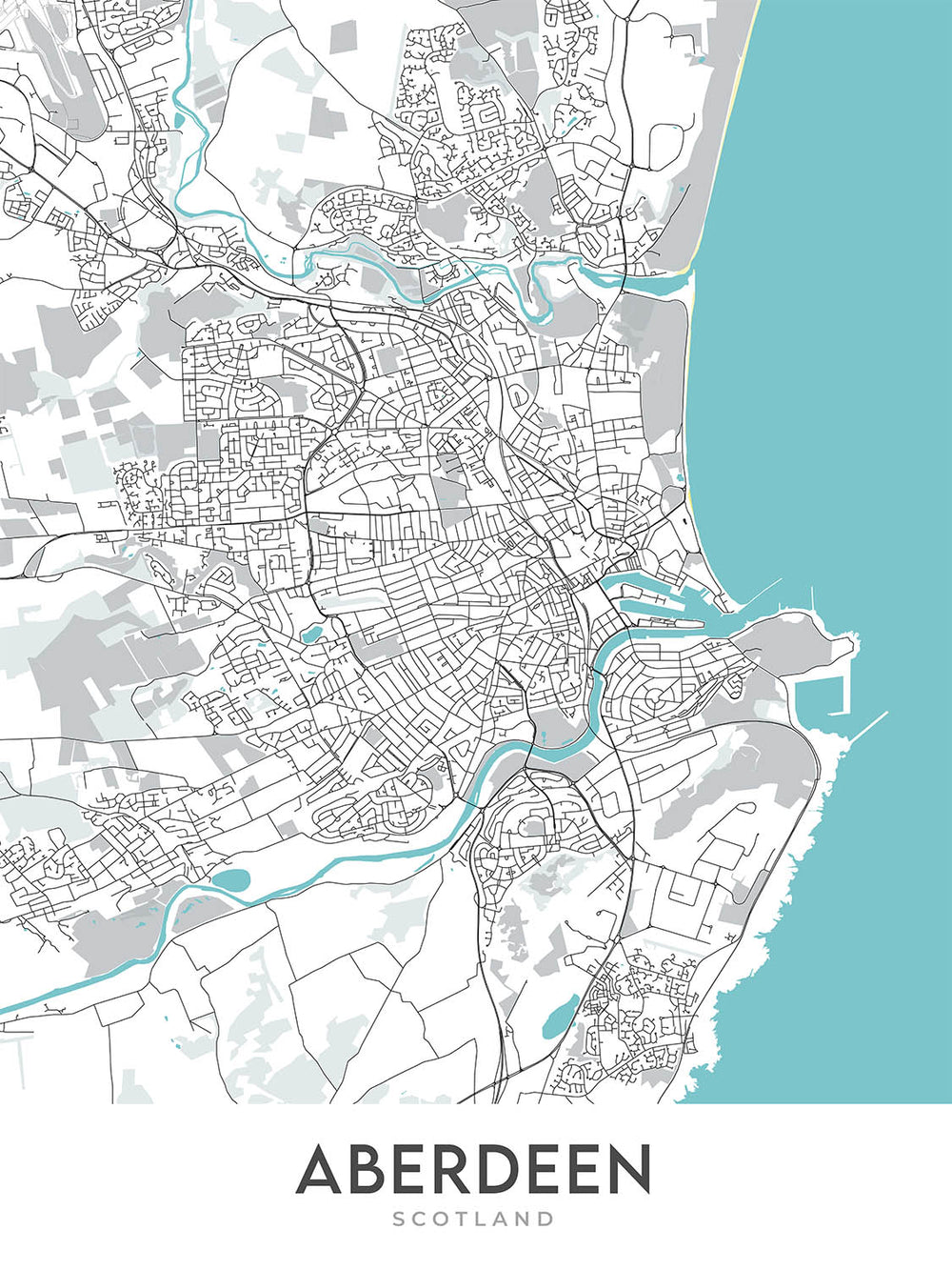 Die Einbeziehung markanter Wahrzeichen wie Aberdeen Beach, Duthie Park und Marischal College verleiht diesem Kunstwerk zusätzliche Tiefe. Diese Wahrzeichen sind nicht bloß Punkte auf einer Karte, sondern Symbole der reichen kulturellen und historischen Vielfalt der Stadt. Die Flüsse Dee und Don, die anmutig durch die Stadt fließen, sind ebenfalls abgebildet und fügen ein natürliches Element hinzu, das einen schönen Kontrast zum strukturierten städtischen Raster bildet. Diese Mischung aus natürlichen und von Menschenhand geschaffenen Merkmalen macht die Karte zu einer ausgewogenen Darstellung des einzigartigen Charakters Aberdeens.