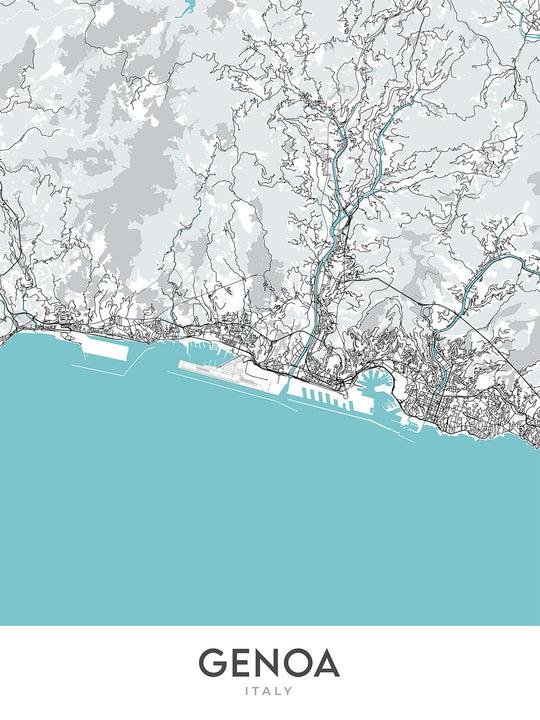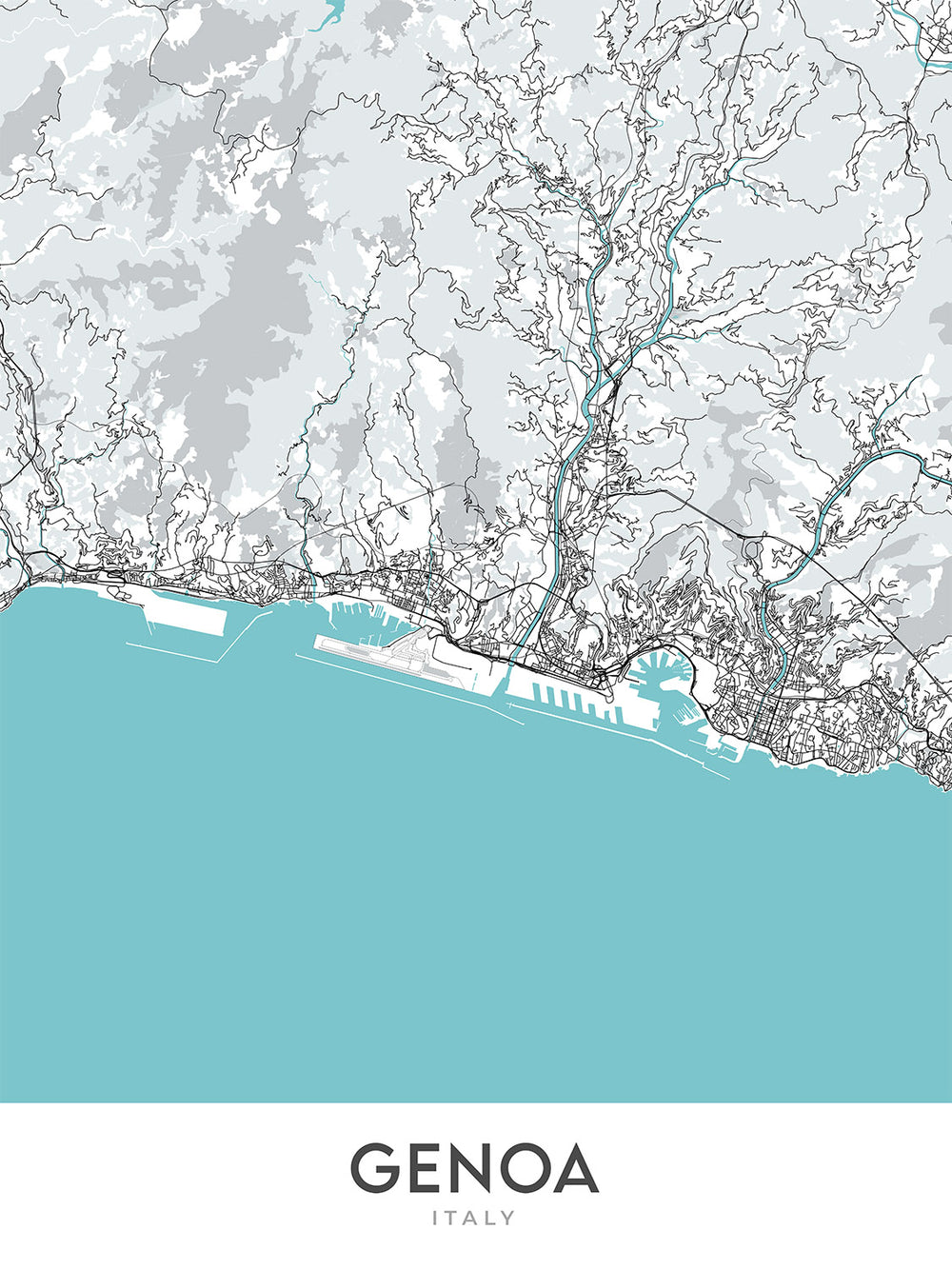 Diese Karte von Genua ist die perfekte Möglichkeit, Ihrer Inneneinrichtung einen Hauch von modernem Stil zu verleihen. Es ist auch ein tolles Geschenk für alle, die Karten, Geographie oder Reisen lieben. Egal, ob Sie Einheimischer oder Tourist sind, diese Karte wird Ihnen sicher gefallen.