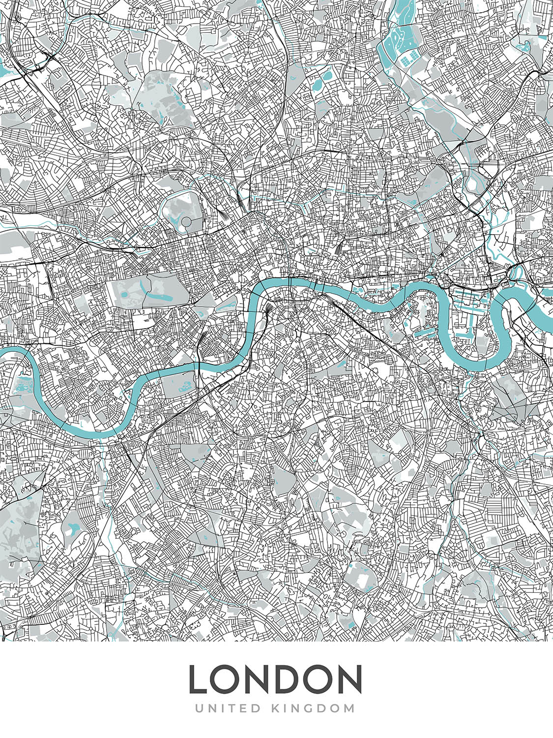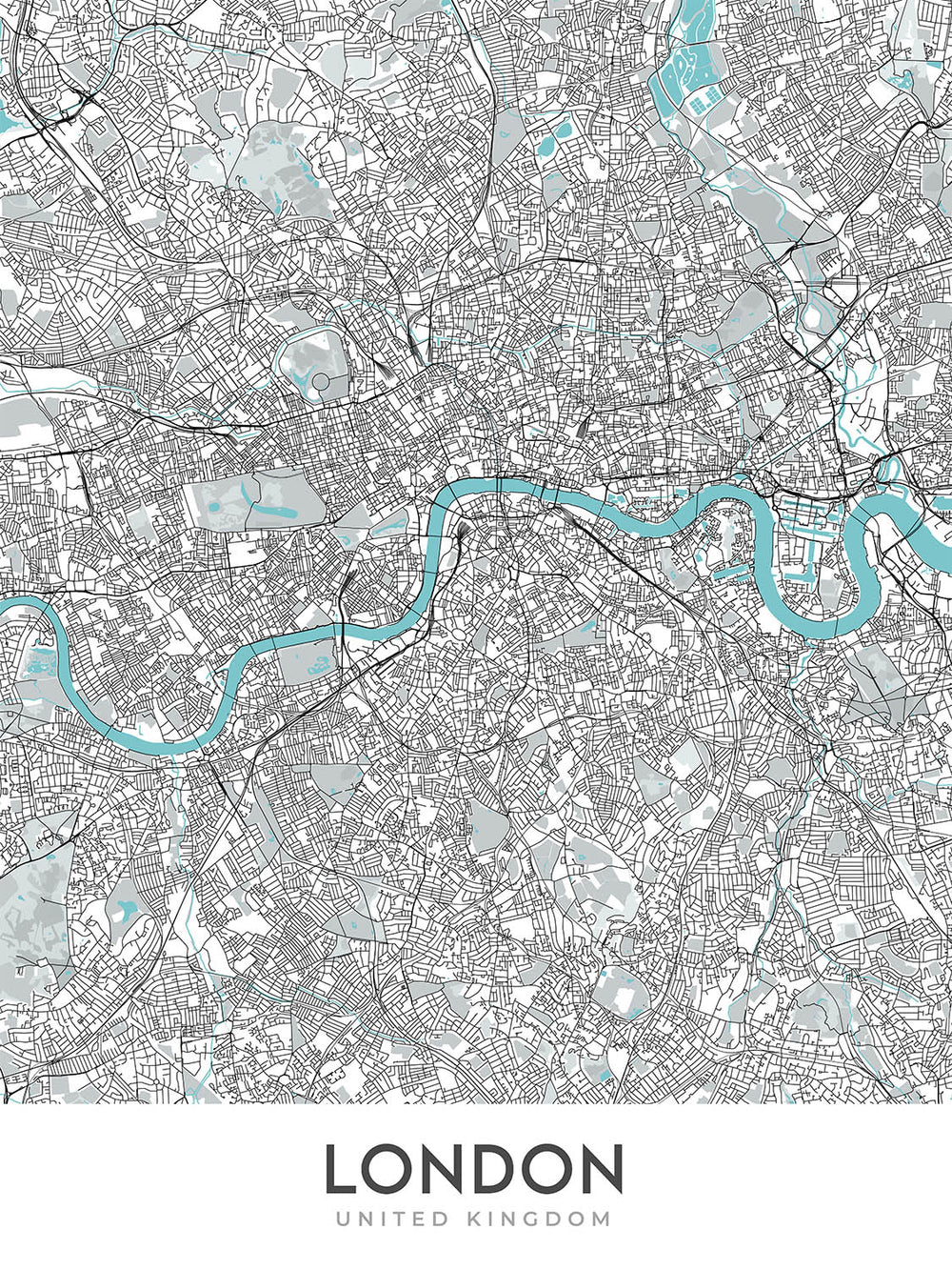 Diese Karte von London ist eine moderne und detaillierte Straßenkarte ohne Etiketten, perfekt für alle, die ein stilvolles und informatives Kunstwerk für ihr Zuhause oder Büro suchen. Die Karte deckt einen großen Bereich der Stadt ab, einschließlich vieler der beliebtesten Viertel und Sehenswürdigkeiten.