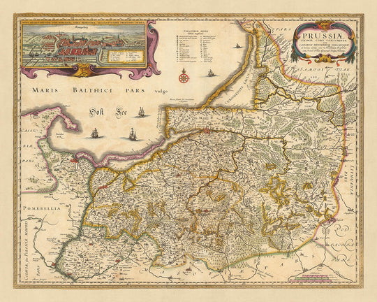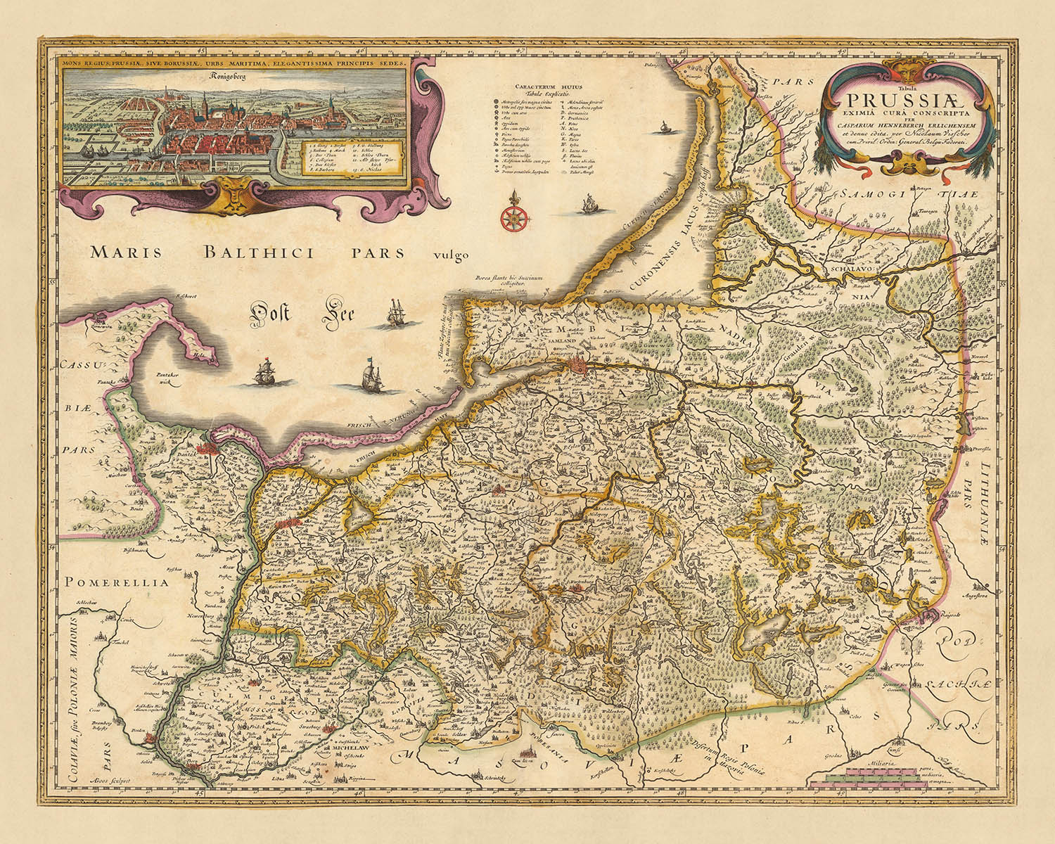 Die lateinische Übersetzung der Karte lautet „Karte von Preußen mit eingefügter Abbildung der Stadt Königsberg“. Es bietet eine Fülle von Informationen über die politischen Spaltungen und Regionen der Zeit. Der Schwerpunkt der Karte liegt auf Preußen und bietet einen interessanten Einblick in die geopolitische Landschaft des 17. Jahrhunderts.