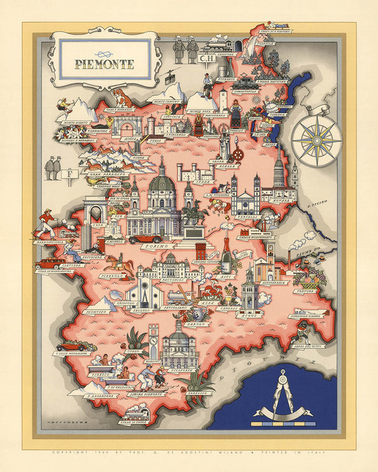 Die Karte deckt die gesamte italienische Region Piemonte, oder Piemont, ab und ist voller Informationen. Die Karte zeigt farbenfrohe Vignetten von Gebäuden, Natur, Aktivitäten, Produkten und Feldfrüchten sowie Städte und Dörfer, die auf Italienisch beschriftet sind. Die Karte verwendet auch Silber und Gold, was zu ihrer Schönheit und Eleganz beiträgt.