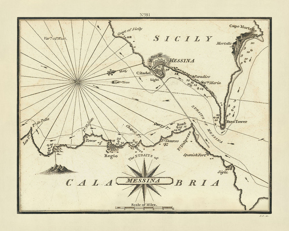 Die Ausrichtung der Karte, mit Westen oben, mag den modernen Betrachter zunächst verwirren, doch sie spiegelt die einzigartigen Navigationsperspektiven ihrer Zeit wider. Sie zeigt detailliert Tiefenangaben, Strömungen und Ankerplätze, die für Seeleute, die die gefährlichen Meerengen befuhren, von entscheidender Bedeutung waren. Die Einbeziehung topografischer Merkmale und die sorgfältige Beschriftung von Städten wie Messina und Reggio, komplett mit ihren Befestigungen, macht diese Karte zu einem reichhaltigen historischen Dokument, das Einblicke in die geopolitische Bedeutung dieser Regionen im frühen 19. Jahrhundert bietet.