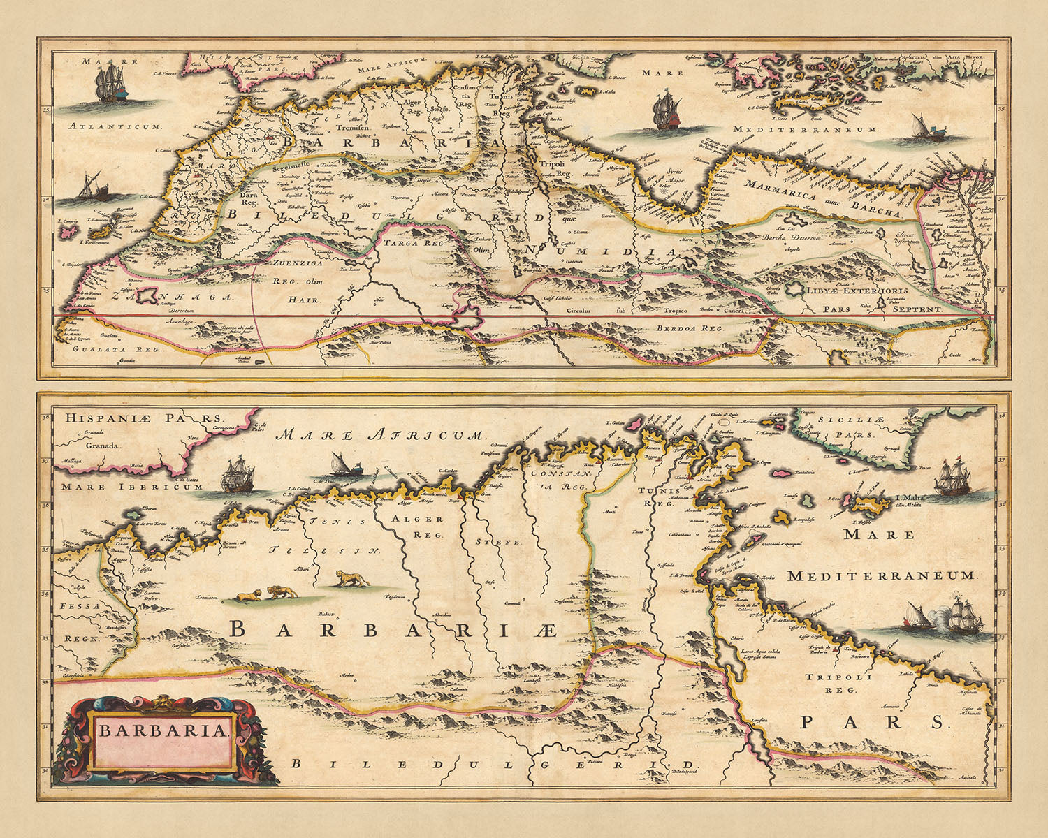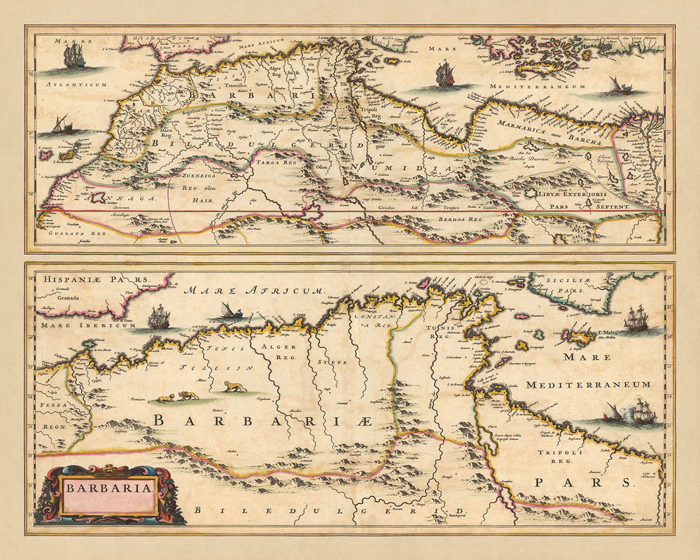 Die Karte „Barbaria“ zeigt die Schönheit der Kartografie und die Kunstfertigkeit ihrer Schöpfer. Jede handkolorierte gravierte Karte auf dem Blatt zeugt vom Können und der Liebe zum Detail des Kartenmachers. Es deckt Nordafrika und das Mittelmeer ab, wobei die obere Tafel fast die gesamte Nordküste Afrikas zeigt und die untere Tafel eine detaillierte Darstellung des Gebiets in der Nähe des heutigen Algier bietet. Die Karte zeigt politische Grenzen, Städte, Wasserstraßen, Kanäle, Sehenswürdigkeiten, Wildtiere und Berge, die durch die dekorative Titelkartusche und das Bildrelief zum Leben erweckt werden.