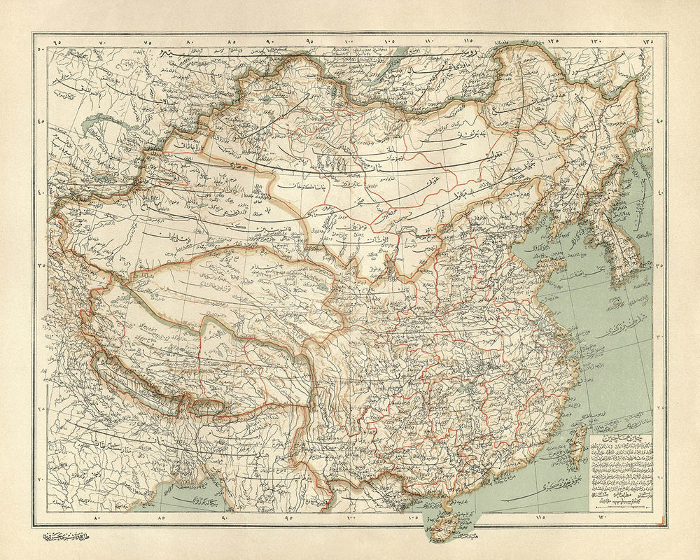 Arabische Karte von China und der Mongolei von Hafiz Ali Esref, 1896: Peking, Yangtse-Fluss, Gobi-Wüste, Himalaya, Shanghai