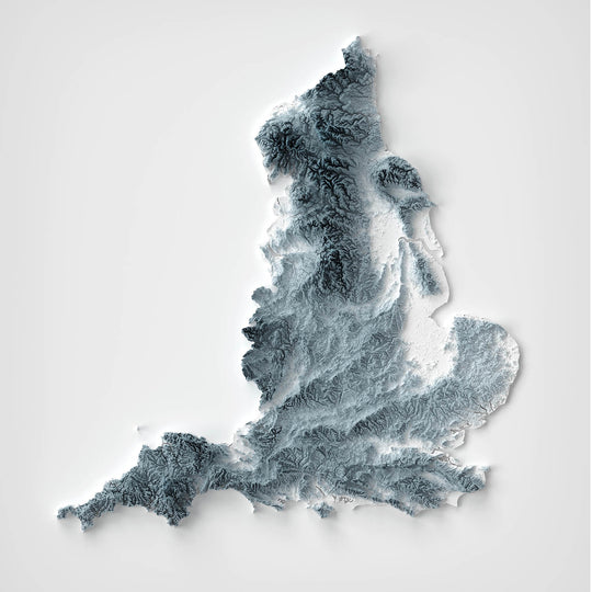 Diese topografische Darstellung Englands ist sowohl eine Hommage an seine natürlichen Landformen als auch eine Einladung zur Erkundung – ein Kunstwerk, in dem jede Kurve und Kontur einen Teil der Geschichte der Nation erzählt und in dem Licht und Schatten vereint sind, um die beständige Schönheit dieser bemerkenswerten Landschaft einzufangen.