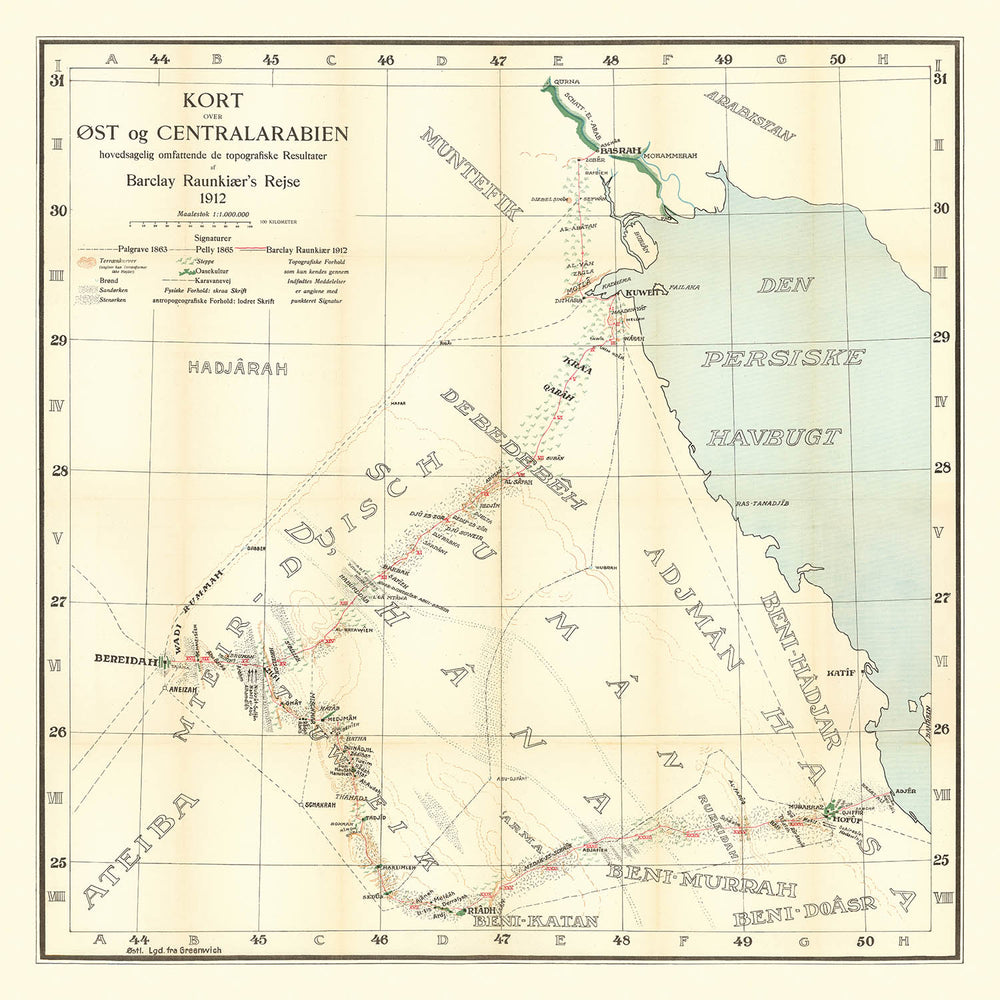 Karte über Øst- und Zentralarabien, erstellt von dem renommierten dänischen Entdecker Anders Christian Barclay Raunkiaer im Jahr 1912, ist ein fesselndes Fenster in die frühe Erkundung der Arabischen Halbinsel im 20. Jahrhundert. Diese Karte zeichnet Raunkiaers Expedition durch die weitgehend unerforschten Wüsten des östlichen und zentralen Arabien sorgfältig nach. Sie verfolgt auch die Routen der Mitentdecker William Gifford Palgrave und Sir Lewis Pelly und bietet einen umfassenden Überblick über die Erkundungsgeschichte der Region.