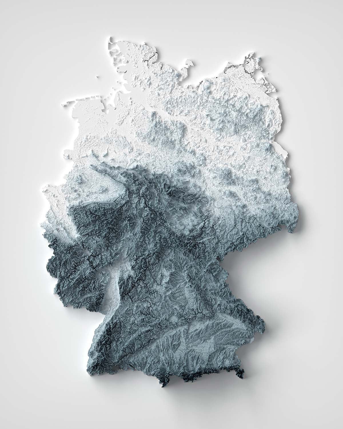 Unsere schattierten Reliefdrucke verwenden ultra-hochauflösende topografische Daten und einen geheimen 3D-Rendering-Prozess, um die Illusion von erhöhtem Terrain zu erzeugen – als ob die Berge gleich von der Seite abheben würden. Keine Beschriftungen, keine Grenzen, keine Ablenkungen. Nur die rohe Form des Landes, lebendig gemacht in einem klaren, modernen Stil.