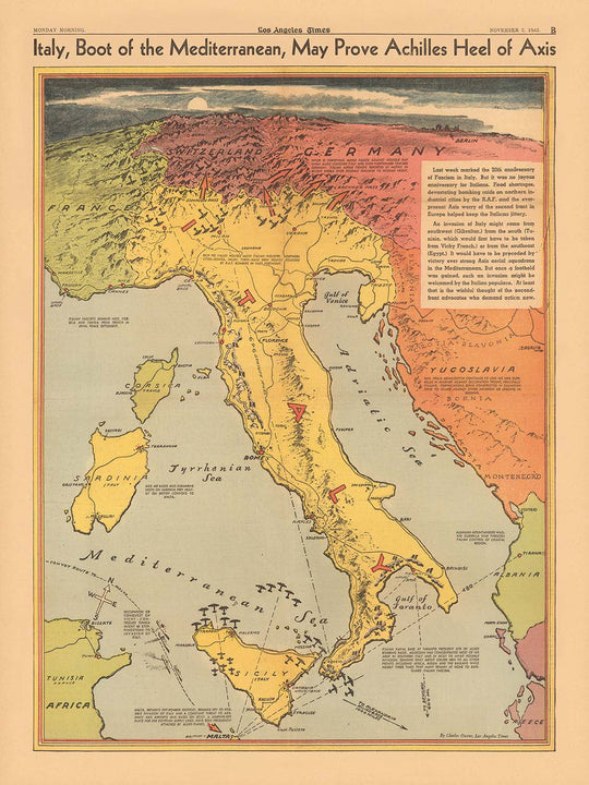 Tauchen Sie ein in die entscheidenden Momente des Zweiten Weltkriegs mit dieser bemerkenswerten Karte von 1942, "Italien, der Stiefel des Mittelmeers, könnte die Achillesferse der Achsenmächte sein," meisterhaft erstellt von Charles Owens für die Los Angeles Times. Diese Karte ist mehr als eine geografische Darstellung – sie ist ein lebendiges, historisch aufgeladenes Dokument, das die angespannte Atmosphäre und strategischen Berechnungen der Ära einfängt. Entworfen an einem kritischen Punkt im Krieg, spiegelt sie die Hoffnungen und Ängste der Alliierten wider, während sie Italiens einzigartige Geografie als potenzielle Verwundbarkeit in den Verteidigungen der Achsenmächte betrachteten.