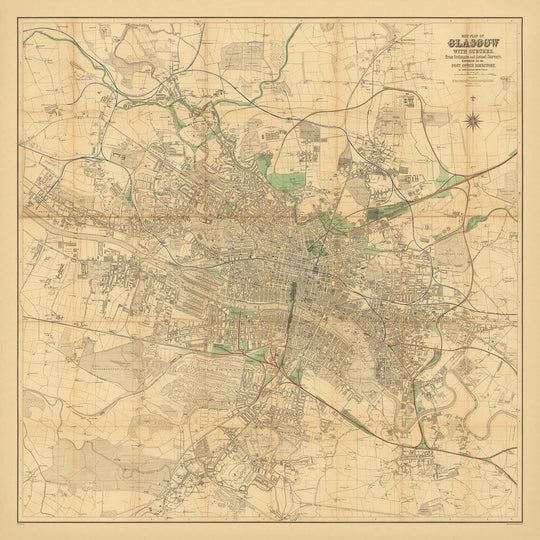 Über den urbanen Kern hinaus zeigt die Karte Grünflächen und Parks, die eine Auszeit vom pulsierenden Stadtleben boten. Diese Bereiche, zusammen mit der detaillierten Darstellung von Glasgows Straßen und Infrastruktur, spiegeln das Engagement der Stadt wider, industrielles Wachstum mit Lebensqualität in Einklang zu bringen. Diese Karte ist nicht nur ein Werkzeug zur Navigation; sie ist ein historisches Dokument, das den Geist von Glasgow in einem entscheidenden Moment seiner Geschichte einfängt und somit eine wertvolle Ergänzung für jede Sammlung historischer Karten darstellt.