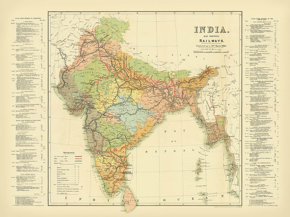 In einer Zeit rascher infrastruktureller Expansion in Auftrag gegeben, wurde diese Karte erstellt, um das explosive Wachstum des indischen Eisenbahnsystems zu dokumentieren und zu feiern. Die britische Kolonialverwaltung sah die Eisenbahn sowohl als Symbol als auch als Werkzeug ihrer Herrschaft, das die Bewegung von Truppen, Waren und Ideen über weite und vielfältige Terrains erleichterte. Judds Werk differenziert elegant zwischen breiten, Meter- und Schmalspurlinien und verwendet ein raffiniertes Farbcodierungssystem, um den Betrachter durch die Komplexität des Netzes zu führen. Projektierte Linien und im Bau befindliche Eisenbahnen sind ebenfalls deutlich gekennzeichnet und bieten einen Einblick in die Ambitionen und Prioritäten der Epoche.