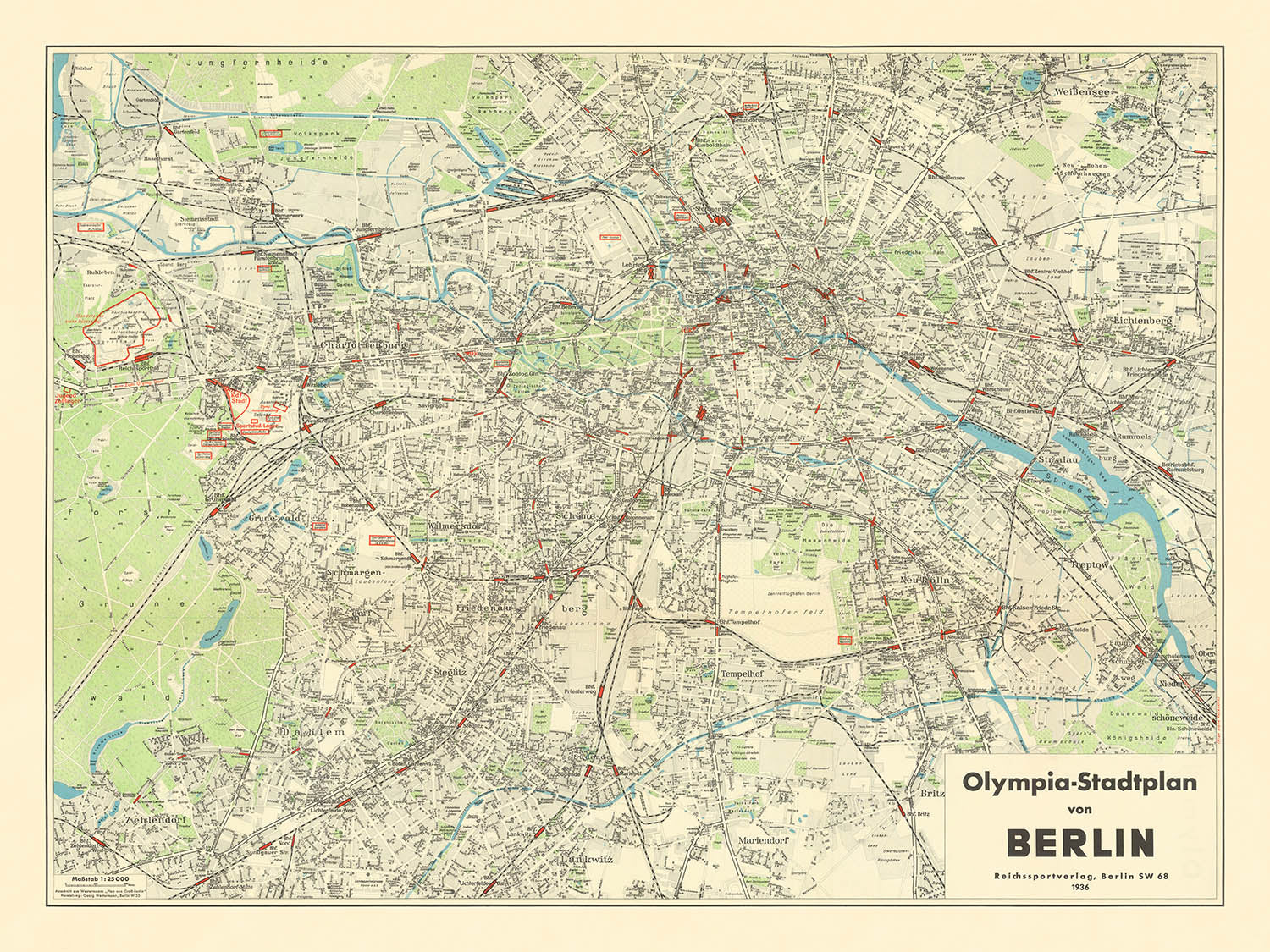 Betreten Sie das Herz des Berlins der 1930er Jahre mit dem "Olympia-Stadtplan von Berlin", einer meisterhaft detaillierten Stadtkarte, die 1936 vom Reichssportsverlag veröffentlicht wurde. Diese Karte wurde speziell für die historischen Olympischen Sommerspiele 1936 erstellt und bietet einen einzigartigen Einblick in eine Stadt an der Kreuzung von Geschichte und Spektakel. Ihr ursprünglicher deutscher Titel, der reich an olympischer Verheißung ist, deutet auf den Zweck der Karte hin: internationale Besucher durch die lebendige, ausgedehnte Metropole zu führen, während sie die Spiele der XI. Olympiade ausrichtete - ein Ereignis, das zu einem der am meisten kritisierten und diskutierten der modernen Geschichte werden sollte.
