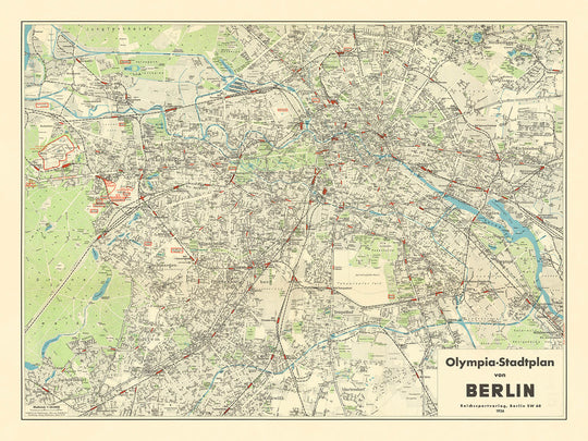 Wahrzeichen, die Berlins Identität geprägt haben, werden elegant hervorgehoben, vom ikonischen Brandenburger Tor und dem imposanten Reichstagsgebäude bis hin zum grandiosen Berliner Dom und dem geschäftigen Alexanderplatz. Die Einbeziehung der Museumsinsel spricht für Berlins Ruf als Zentrum für Kunst und Wissenschaft, während der Zoologische Garten und der historisch bedeutende Potsdamer Platz den dynamischen Mix aus Freizeit und Handel der Stadt widerspiegeln. Jedes dieser Orte wäre ein Mittelpunkt für olympische Besucher gewesen, und ihre Präsenz auf der Karte bietet eine greifbare Verbindung zur gelebten Erfahrung von 1936.