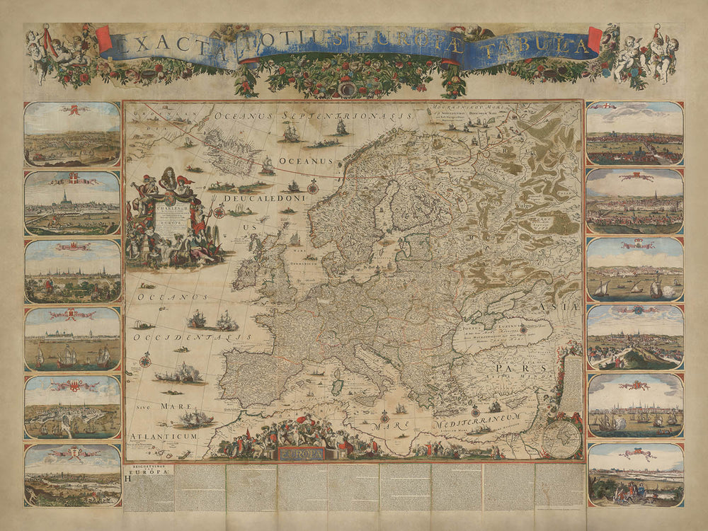 Das Design der Karte ist ein Zeugnis für den Ruf der Familie Visscher für Exzellenz in der Kartografie. Nicolaes Visscher II, der in die Fußstapfen seines Vaters und Großvaters trat, verlieh dieser Karte sowohl wissenschaftliche Genauigkeit als auch künstlerischen Flair. Die kartografische Projektion zeigt die Geographie Europas mit bemerkenswerter Klarheit, während die Einbeziehung von Stadtansichten und Anmerkungen einen reichen historischen Kontext bietet. Dieser doppelte Fokus auf Ästhetik und Information exemplifiziert das Goldene Zeitalter der niederländischen Kartografie, eine Zeit, in der Karten ebenso sehr Geschichten erzählten wie sie der Navigation dienten.