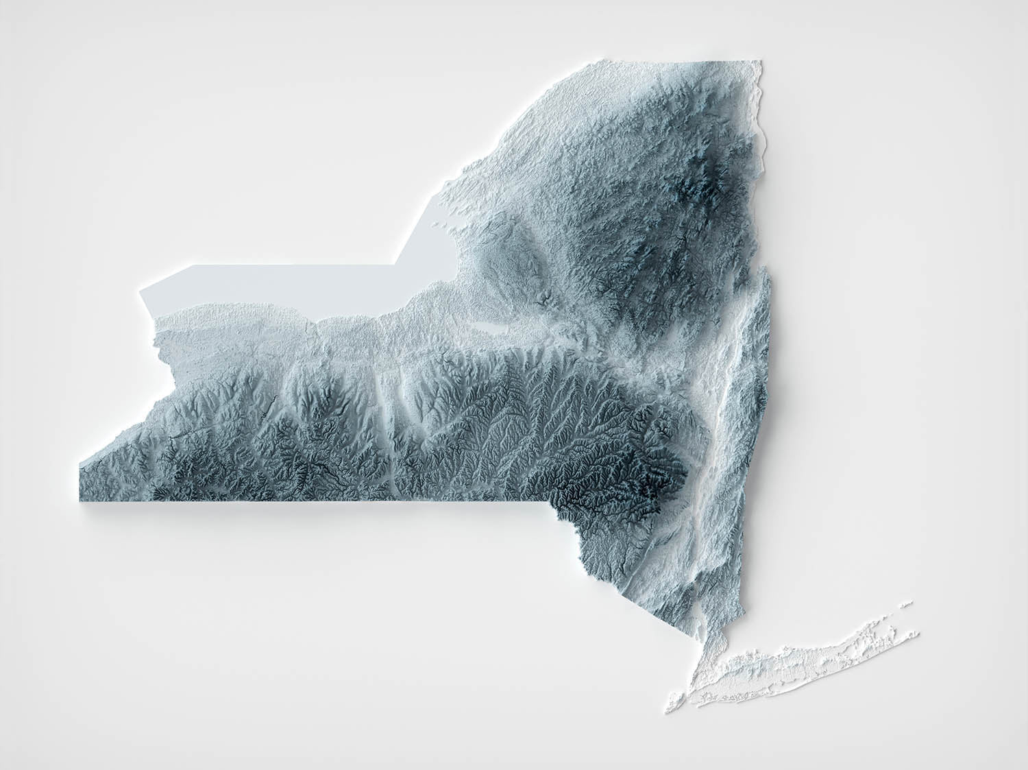 Begib dich auf eine Reise durch die vielfältigen und ikonischen Landschaften von New York mit dieser einzigartig gestalteten 3D-topografischen Reliefkarte. Die Geographie von New York bietet eine eklektische Mischung aus Landschaften, von der pulsierenden urbanen Ausdehnung der Stadt New York bis zur ruhigen natürlichen Schönheit der Adirondack Mountains.